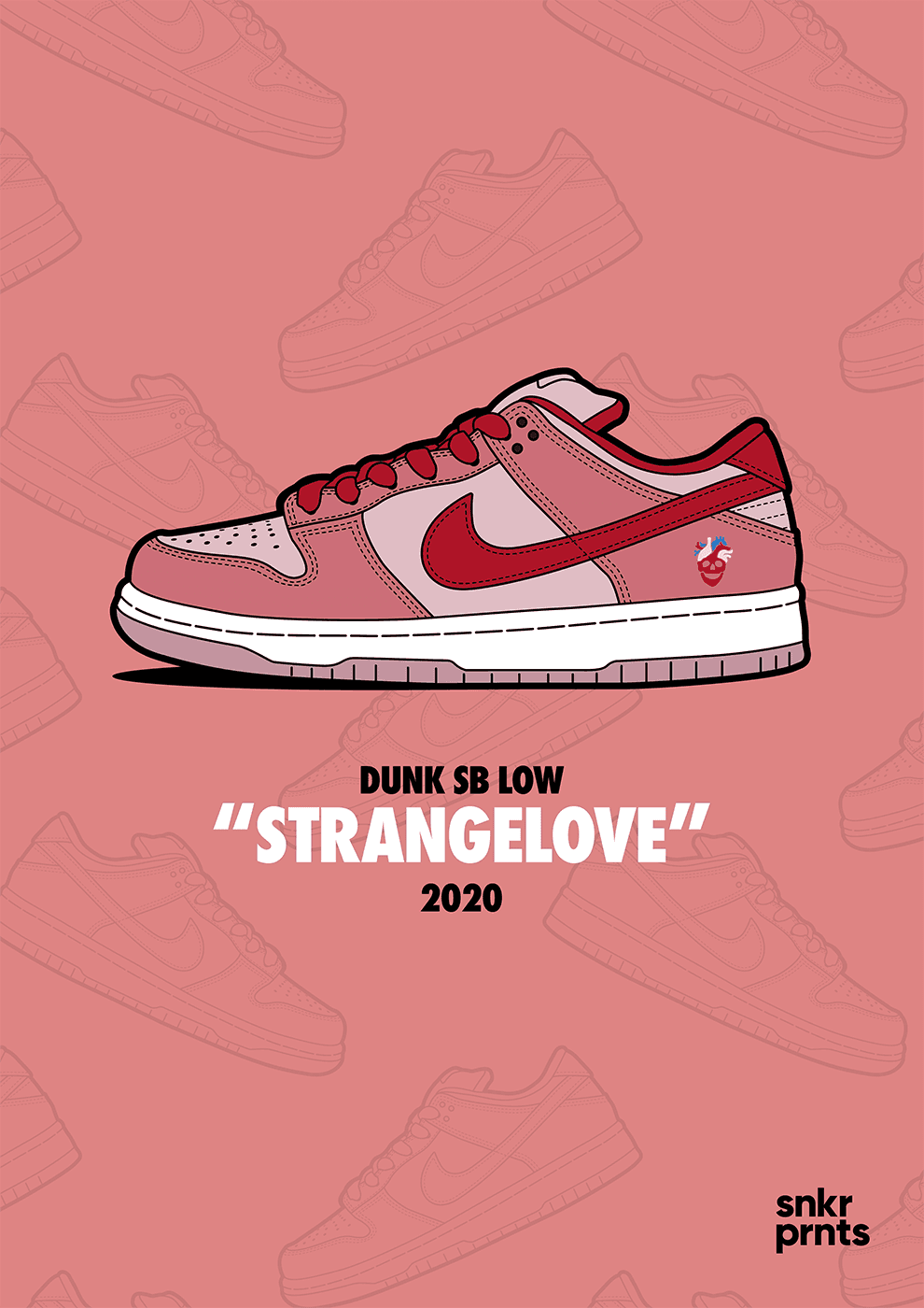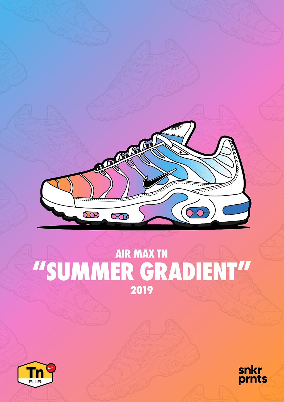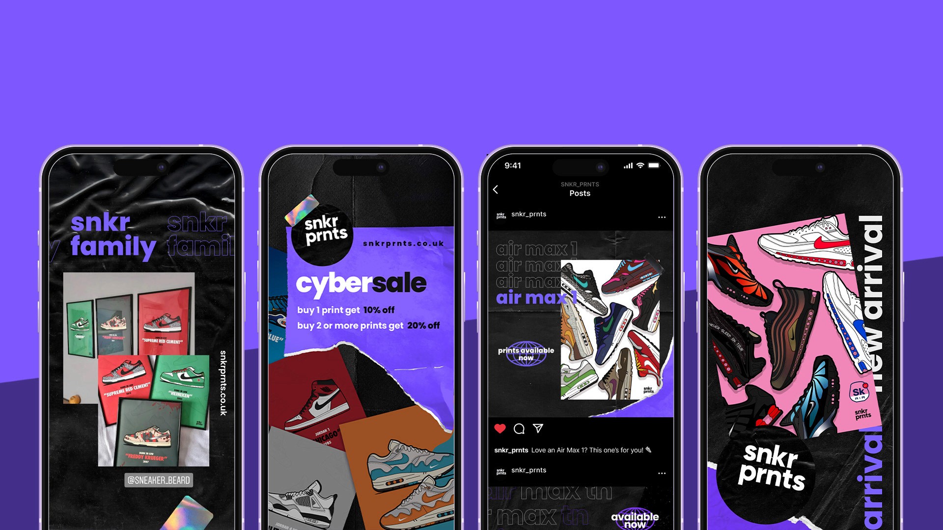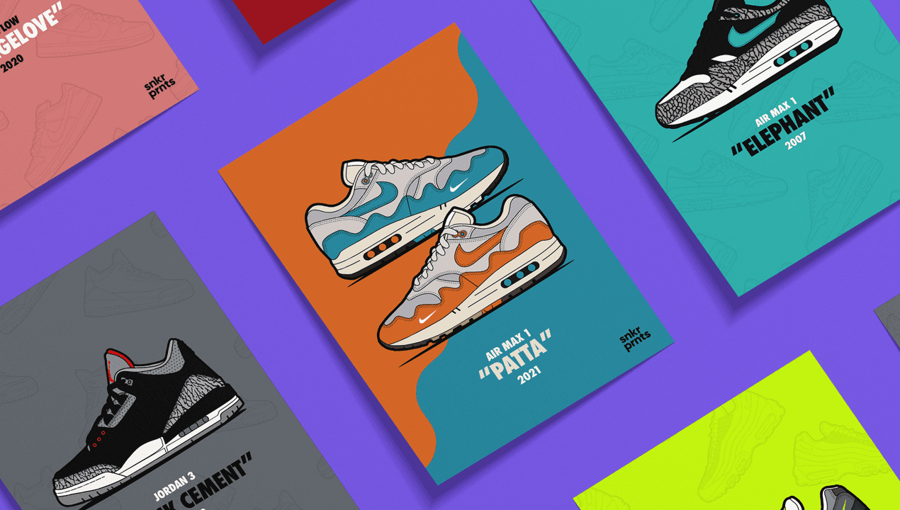 I created snkr prnts. Each print was a detailed, stylised artwork of an iconic sneaker, from classic Air Max colourways to limited edition collaborations, designed to highlight the shape, materials and story behind each shoe. I built the visual identity and social presence to position snkr prnts as a small independent label for sneaker art collectors.